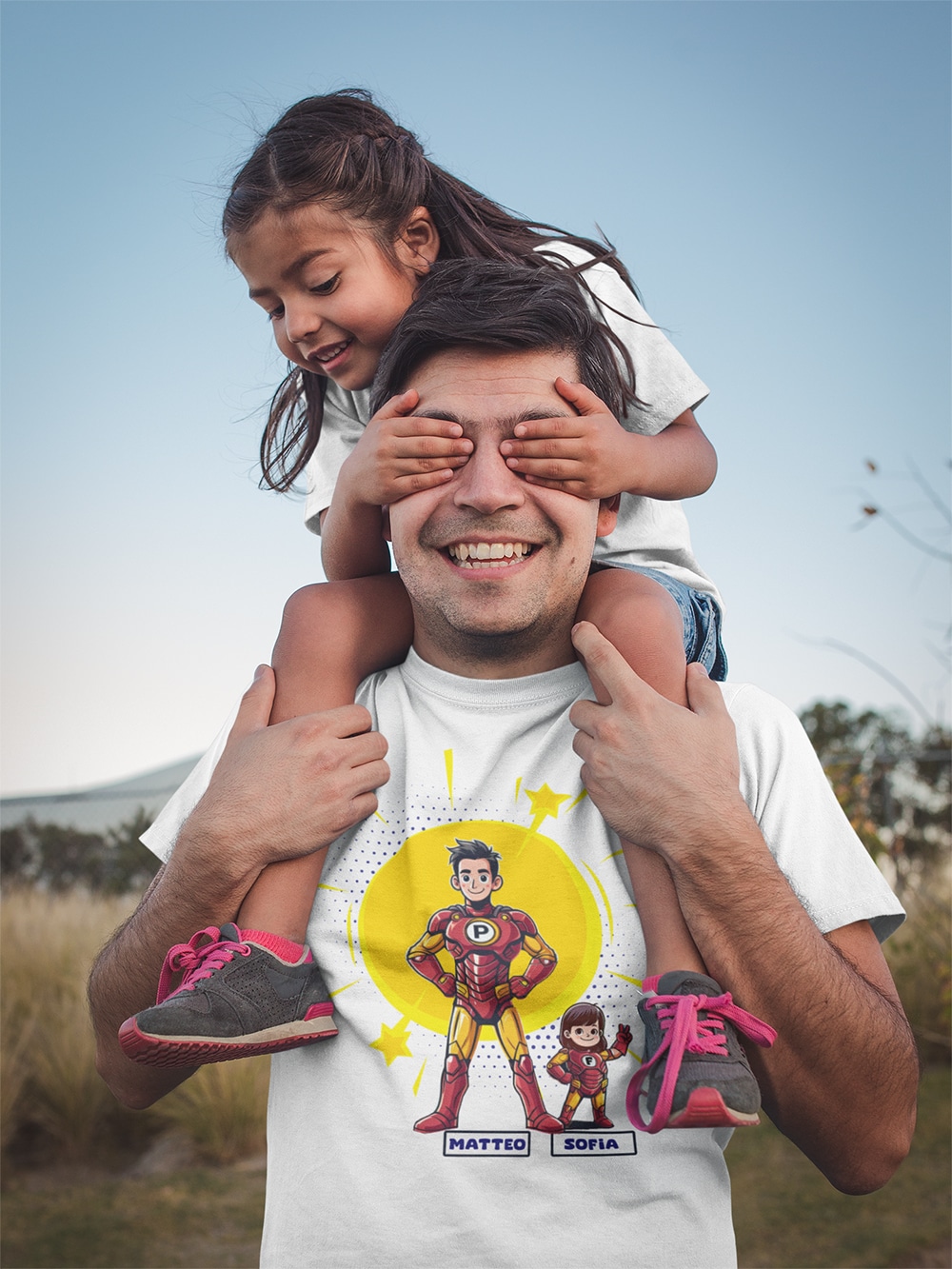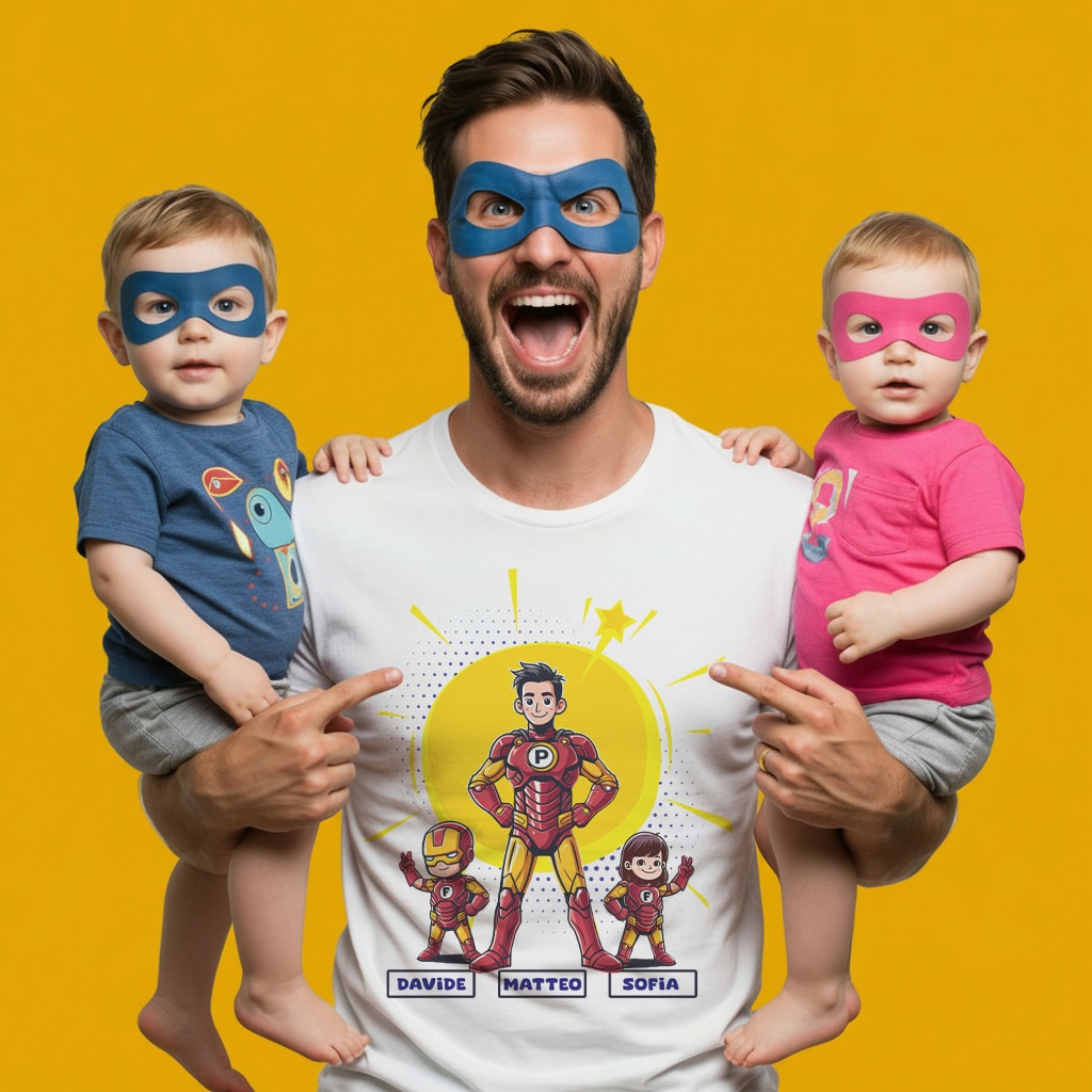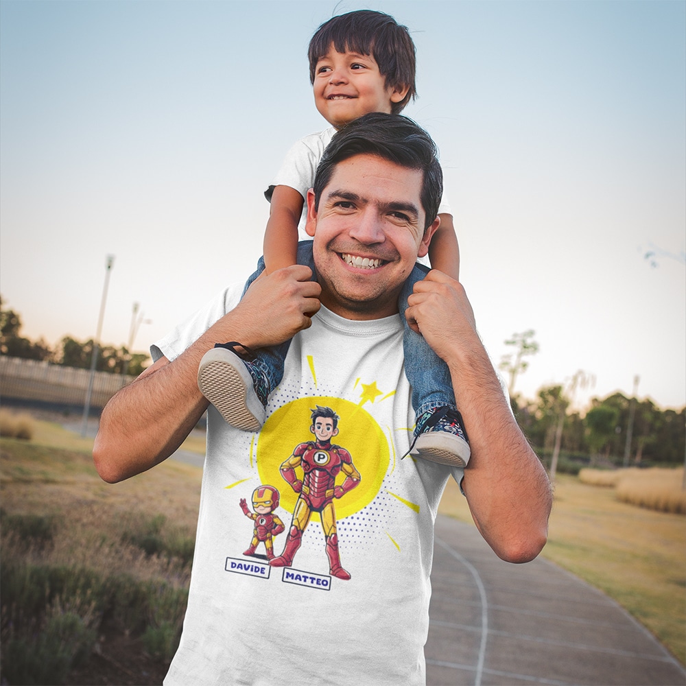 La T-shirt Iron man Papà e figli di New Indastria è personalizzabile con i nomi sia del papà che del figlio/figli. Il regalo perfetto per gli appassionati del personaggio di Iron man, da regalare per la festa del papà o in qualsiasi altra occasione.