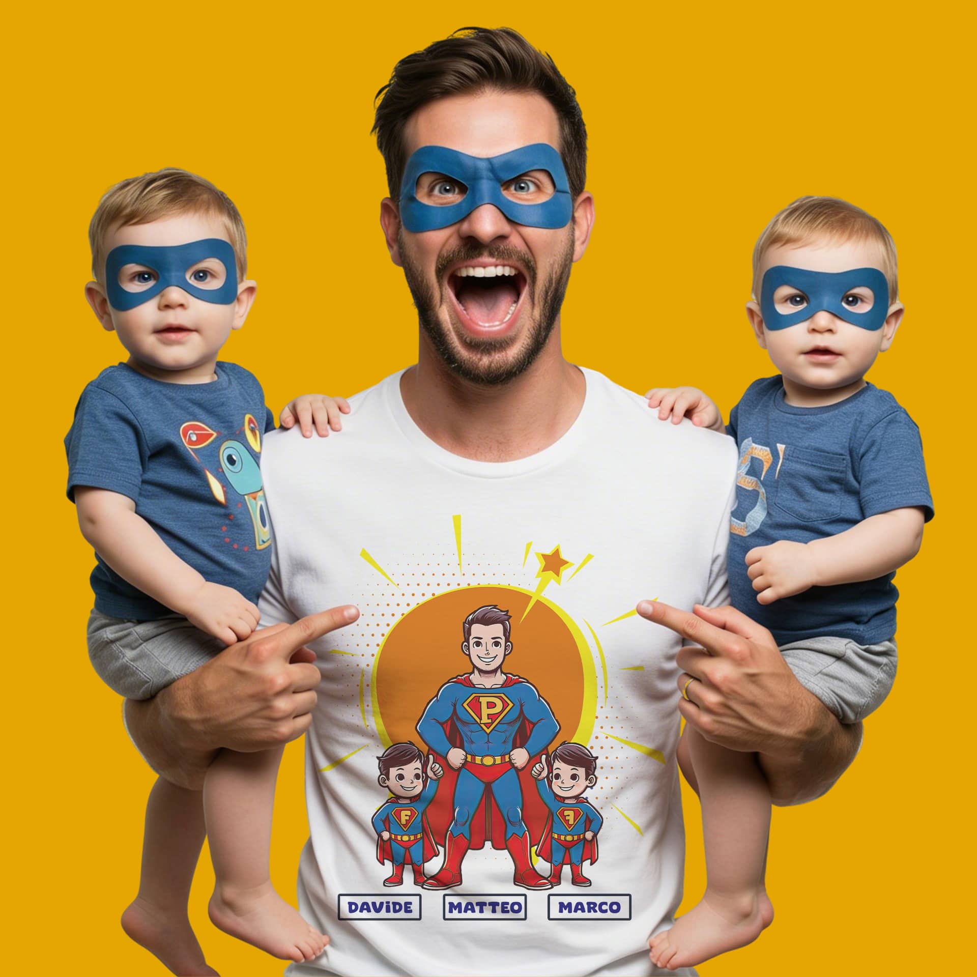 La T-shirt Superman Papà e figli di New Indastria è personalizzabile con i nomi sia del papà che del figlio/figli. Il regalo perfetto per gli appassionati del personaggio di Superman, da regalare per la festa del papà o in qualsiasi altra occasione.